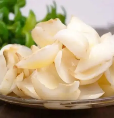 選擇成熟度好、光滑細膩、果肉肥厚、鱗片大小一致、潔白完好、無病斑蟲眼的鮮百合作原料,用小刀削去百合根基,去除殘根,分片分級輕輕刷洗后沖洗干凈,用鐵鍋燒好沸水待用,百合鱗片下鍋后,保持水沸,并均勻攪動。煮燙的時間以原料略軟,掰斷鱗片時有清脆響聲,有較強彈性為度,一般需4~6分鐘。撈出煮燙好的百合鱗片,放入冷水冷卻散熱,然后撈出瀝干備用。
